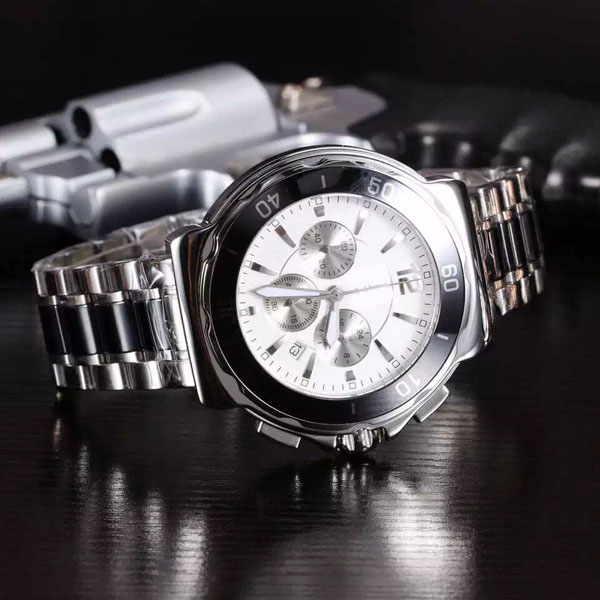 经典男士腕表 男装店手表货源 6针有历 进口石英机芯 复刻手表批发 精钢间陶瓷表带